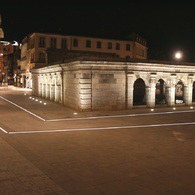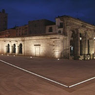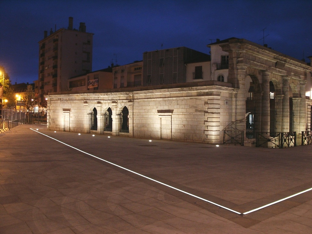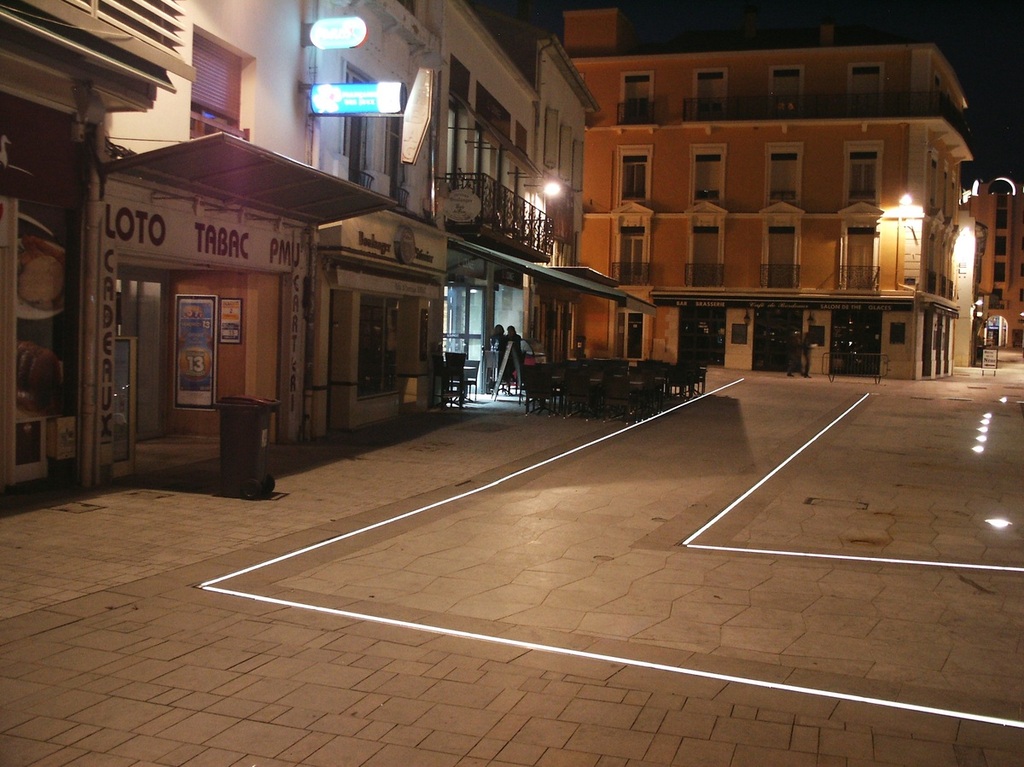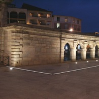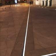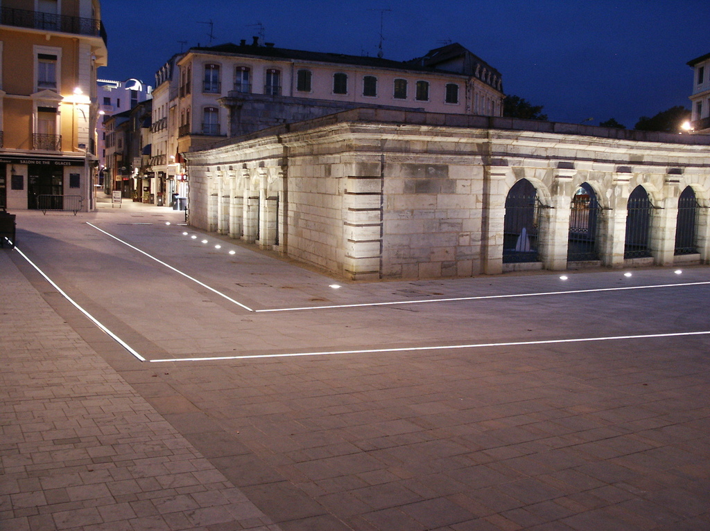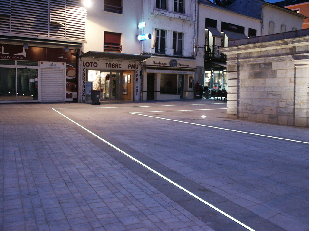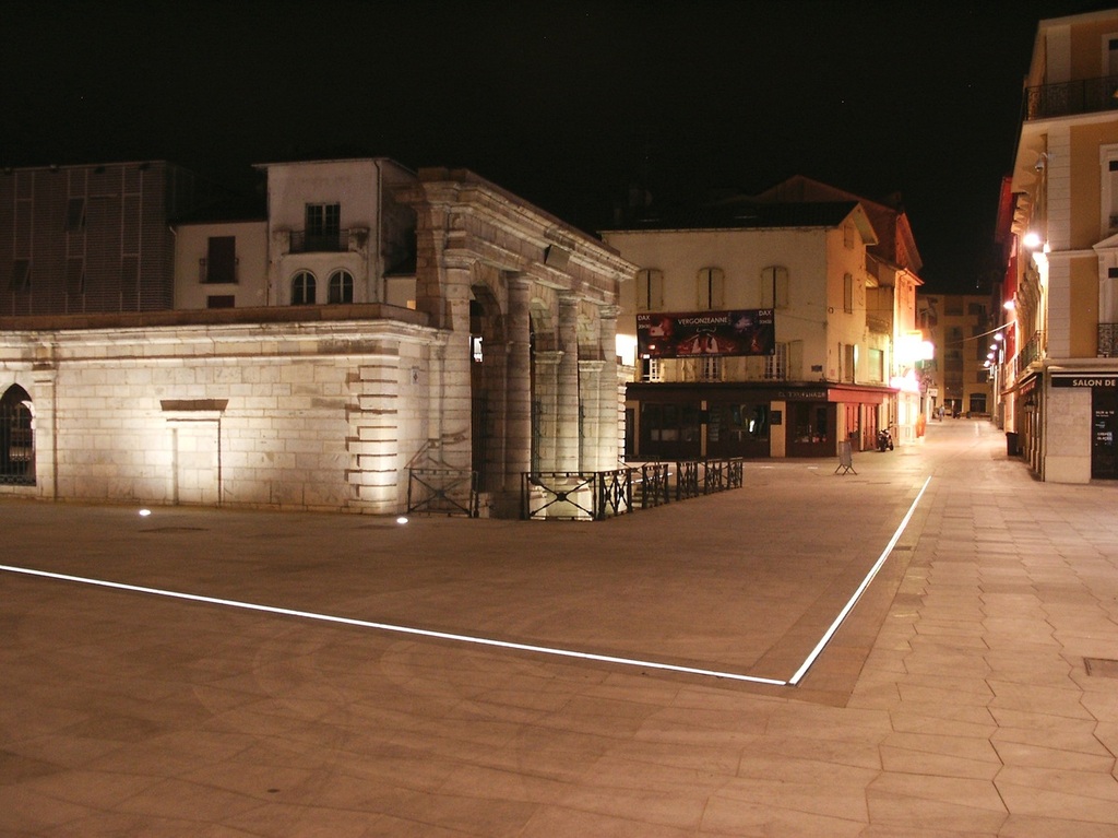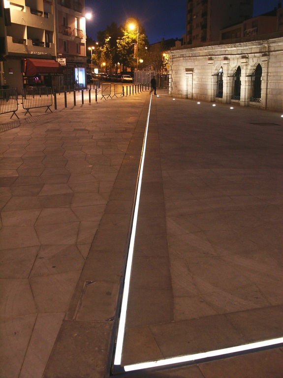 Dimmable linear LED lighting combined with drainage system, installed on the renovated square around the "fontaine chaude" in the historical hart of the French town of Dax.