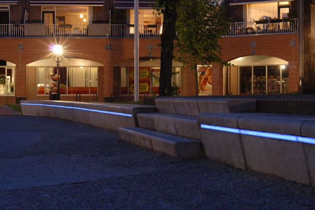 Decorative lighting of concrete benches Location: Lunteren, Netherlands Partner: LIGHTRONICS, Waalwijk, Netherlands Product: LEDline 100 cm blue (IP67 & 4x IK10)